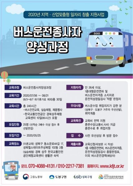이밖에도, 구는 버스운수업 종사를 희망하는 이들에게 무료 교육과 취업지원의 기회를 제공하는 ‘버스운전종사자양성과정’ 교육생을 5월 25일까지 모집한다.