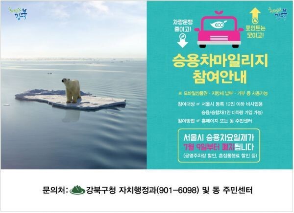[무한뉴스] 강북구가 자동차 사용을 줄여 온실가스 및 미세먼지를 감축하기 위해 승용차마일리지 신규 가입자를 모집한다.
