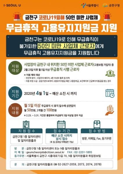 지원대상은 고용보험에 가입한 금천구 소재 50인 미만 사업체의 무급휴직자이다.