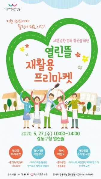 ‘열린뜰 재활용 프리마켓’은 자원 재사용과 나눔의 즐거움을 이웃과 함께 공유할 수 있는 소통의 장으로 5월 27일 개장을 시작으로 10월까지 매월 넷째 주 수요일 오전 10시에서 오후 2시까지 강동구청 앞 열린뜰에서 만날 수 있다.