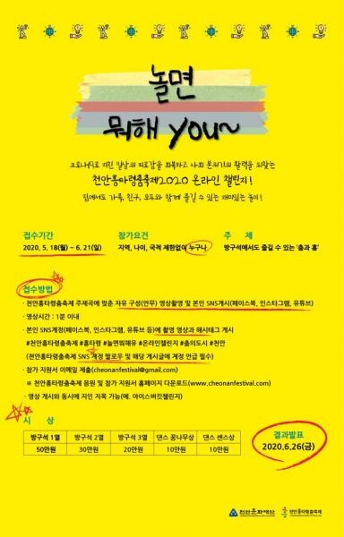 ‘놀면 뭐해 you?’는 9월 23일부터 27일까지 개최되는 천안흥타령춤축제2020의 사전 프로그램으로 시민이 축제의 콘셉트인 ‘춤’과 ‘흥’을 재미있게 해석한 영상을 촬영해 공유하는 공모전이다.