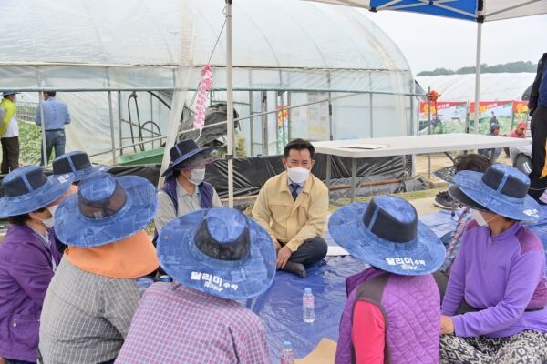 [무한뉴스] 박정현 부여군수는 지난 25일 부여군 굿뜨래 원예영농조합법인에서 주최한 수박재배 성공사례 발표 및 품종평가회 현장을 찾아 재배 시설을 점검하고 관련 농가를 격려했다.