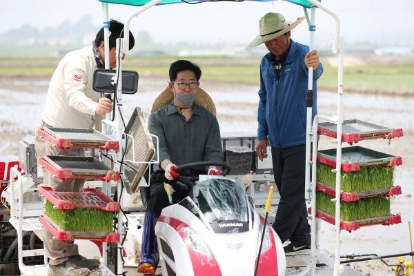 양 지사는 이날 밀짚모자를 쓰고 장화를 신은 채 모판을 옮기고 이앙기를 직접 몰며 모내기가 한창인 농촌 현장의 목소리를 들었다.