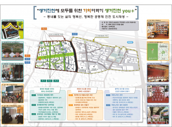 군은 그간 주민들과의 간담회를 수시로 개최하고 도시재생대학 운영, 전문가 컨설팅, 관련 기관 협의를 통해 도시재생 활성화를 위한 사업계획을 준비해 왔으며 ‘생거진천에 모두를 위한 가치더하기 생거진천 YOU+’ 라는 주제로 공모에 응해 대상지로 선정됐다.
