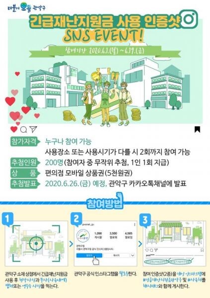 ‘긴급재난지원금 사용 인증샷’ S.N.S 이벤트는 오는 6월 1일부터 6월 19일까지 관악구 공식 인스타그램을 통해 진행된다.