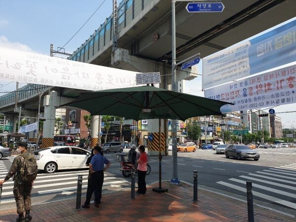 구는 유동인구가 많은 건대입구역사거리, 동서울터미널 앞, 아차산역사거리, 어린이대공원역사거리, 자양사거리 총 6개소에 ‘말하는 그늘막’을 설치해 시범 운영한다.