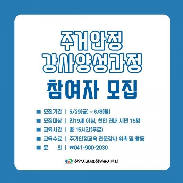 [무한뉴스] 천안시2030청년복지센터는 29일부터 다음 달 8일까지 청년안정교육사업인 ‘주거안정교육 강사양성과정’ 참가자를 모집한다고 밝혔다.