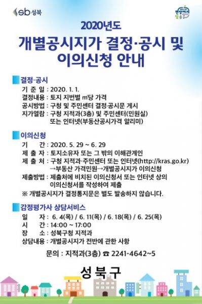 [무한뉴스] 서울 성북구는 2020년 1월 기준으로 조사. 산정한 개별공시지가를 결정·공시하고 오는 29일까지 토지소유자 및 그 밖의 이해관계인에게 이의신청 접수를 받는다고 밝혔다.