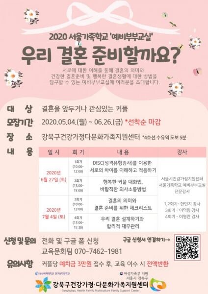 [무한뉴스] 강북구는 강북구건강가정·다문화가족지원센터 주관으로 예비부부교실 ‘우리 결혼 준비할까요?’ 프로그램을 진행한다.