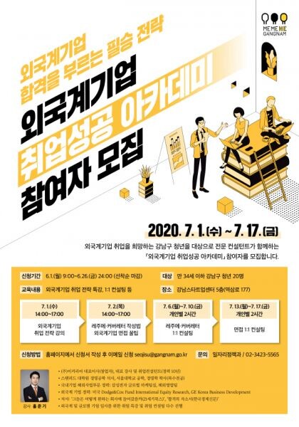[무한뉴스] ‘기분 좋은 변화, 품격 있는 강남’을 구현 중인 강남구가 취업난 극복을 위해 개최하는 ‘외국계 기업 취업성공 아카데미’에 참여할 미취업 청년 20명을 이달 26일까지 선착순으로 모집한다.