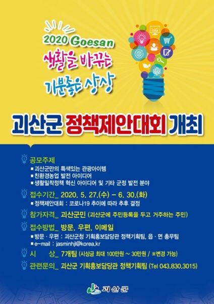 올해 처음 열리는 이번 대회는 괴산군만의 특색 있는 관광 아이템 친환경농업 발전 아이디어 생활밀착정책 혁신 아이디어 및 기타 군정 발전방안 등 세 개 분야로 나눠 진행된다.