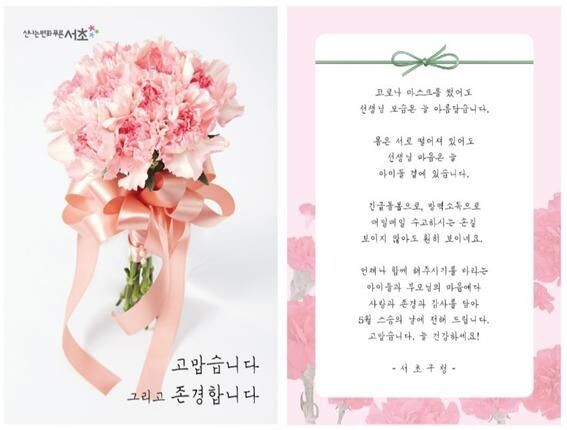 이에 OOO선생님은“문득 날아든 선물, 눈물이 찌익, 우리까지 생각해주는 그 세심함에 또 감동”이라는 감사의 마음을 SNS 상에 남겼고 반포의 한 초등학교 교장선생님은“아이들이 없는 스승의 날인데, 자축도 못하는 분위기에 구청이 산타클로스”며 감사문자를 보내왔다.