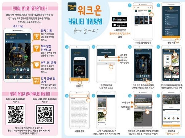 플레이스토어 또는 앱스토어에서 걷기앱인 ‘워크온’을 설치하고 회원가입한 후 청주시 서원구 공식 커뮤니티에 가입하면 이번 사업에 참여할 수 있다.