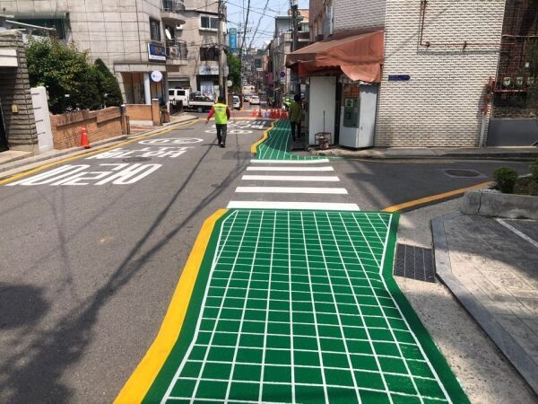 등하굣길 이면도로에 보행공간을 확보하고 차량 통행이 많은 교차로 구간에는 이미지 과속방지턱을 신설한다.