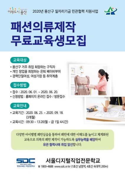 [무한뉴스] 서울 용산구가 2020년 구 일자리기금 민관협력 지원사업의 하나로 오는 23일부터 9월 18일까지 3개월 간 ‘패션의류제작 취업과정’을 운영한다.