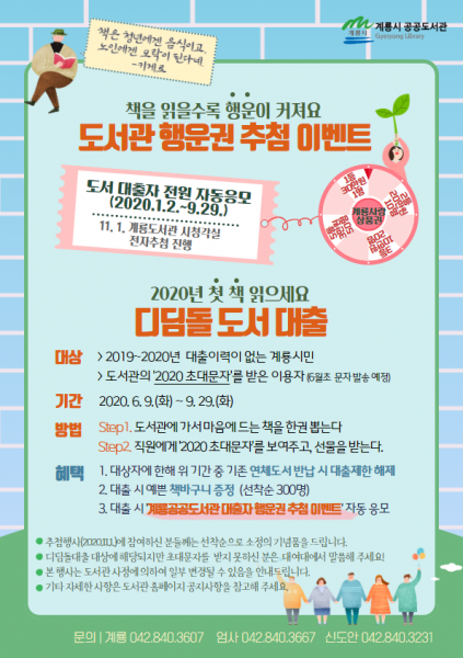 또한 도서 대출 시 올해 1월부터 진행 중인 ‘도서관 행운권 추첨이벤트’에 자동 응모돼 오는 11월 추첨을 통해 계룡사랑상품권을 받을 수 있는 기회도 제공한다.