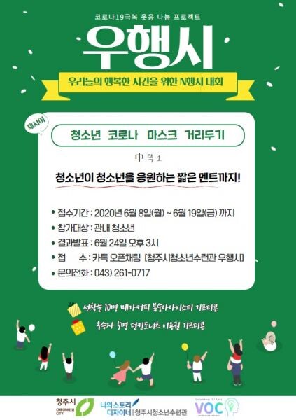 [무한뉴스] 청주시청소년수련관이 코로나19 확산으로 동안 집콕 생활로 지친 관내 청소년들을 대상으로 기획 프로젝트 ‘우행시’ 이벤트를 실시한다.
