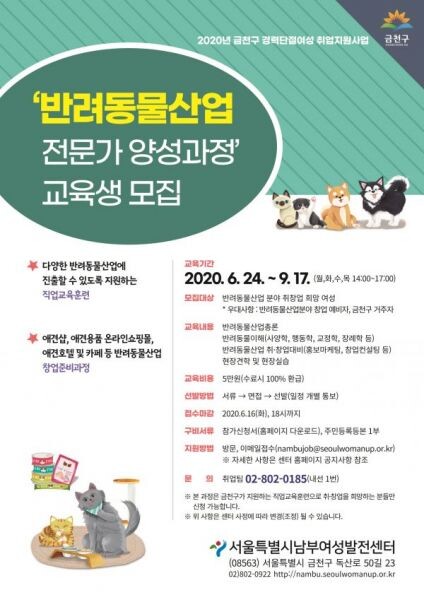 [무한뉴스] 금천구는 6월 24일부터 9월 17일까지 서울특별시남부여성발전센터와 함께 ‘반려동물산업 전문가 양성과정’을 운영한다.