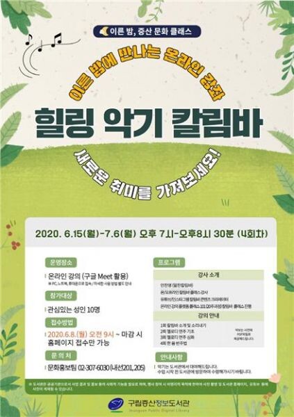 최근 힐링 악기로 각광받고 있는 칼림바를 배워보고 싶은 성인이라면 누구나 신청 가능하며 구립증산정보도서관 홈페이지에서 선착순 10명을 접수 받을 예정이다.