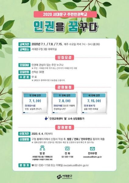 [무한뉴스] 서대문구는 사회적 약자의 권리에 대한 구민들의 이해를 높이기 위해 2020 주민인권학교 ‘인권을 꿈꾸다’를 개최한다고 10일 밝혔다.