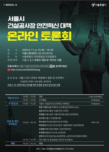 [무한뉴스] 서울시는 건설공사장 안전사고 예방을 위한‘건설공사장 안전 혁신대책’토론회를 오는 11일 오후 3시 온라인으로 개최한다고 밝혔다.