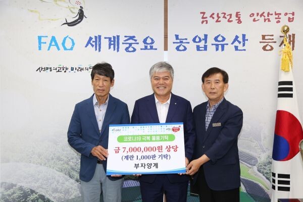 [무한뉴스] 부자양계 영농조합은 지난 11일 금산군청을 방문해 금산의 어려운 이웃들을 위해 700만원 상당의 인삼계란 1000판을 기탁했다.