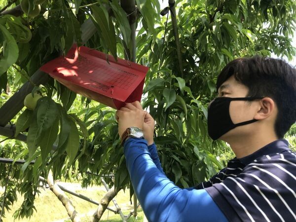 보다 정확한 방제 시기 결정을 위해 지역 과수 농가 주요 지점에 성페로몬트랩 7개소를 설치 후, 5일 합산 25마리 이상 발견시 농가들에게 방제 적기임을 알릴 계획이라고 전했다.
