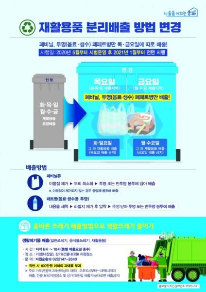 [무한뉴스] 송파구가 재활용품 배출 시 폐비닐과 투명 폐페트병을 지정 요일에 별도 배출, 수거하는 ‘분리배출 요일제’를 시행한다고 12일 밝혔다.