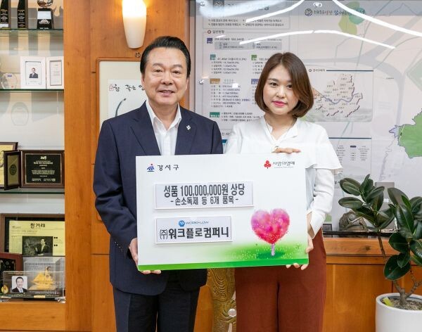 서울 강서구는 12일 오후 3시 구청장실에서 ㈜워크플로컴퍼니로부터 1억원 상당의 ‘코로나19 극복 성품‘을 전달받았다.