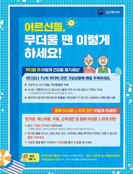 시는 여름철 평균 기온과 폭염일수가 지속적으로 상승하는 상황에서 온열질환에 취약한 노인들을 보호하기 위해 행동요령 포스터와 무더위쉼터 리스트 등을 게시할 예정이다.