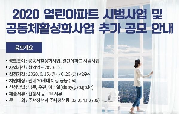 [무한뉴스] 서울 성북구는 상생하고 소통하는 열린아파트 만들기 조성을 위해 오는 26일까지 ‘2020 열린아파트 시범사업’에 참여할 단지를 모집한다고 한다.