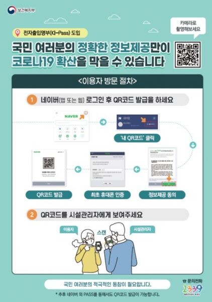 전자출입명부가 도입된 고위험시설 출입 시 이용자는 NAVER 앱에서 1회용 QR코드를 발급받아 시설관리자에게 제시해야 한다.