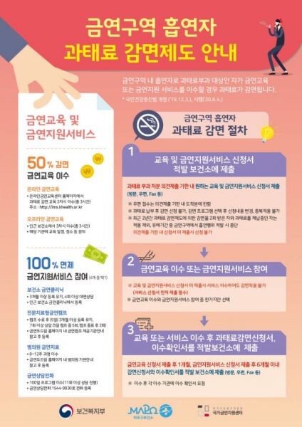 대상 별 감면 혜택은, 3시간 이상 금연교육 이수자의 경우 과태료 금액의 50% 감경, 금연지원서비스 이용자의 경우 과태료 전액 면제가 적용된다.