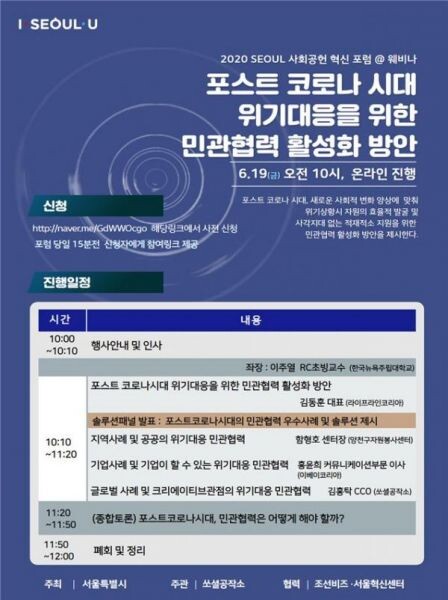 [무한뉴스] 서울시가 코로나19 이후의 위기상황을 보다 효율적으로 대비하기 위해 오는 19일 오전 10시, 서울혁신센터 영상스튜디오에서‘2020 SEOUL 사회공헌 혁신포럼’을 온라인으로 개최한다.