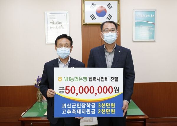 [무한뉴스] NH농협은행 괴산군지부가 16일 지역사회를 이끌어갈 인재 육성과 군 발전을 위해 써달라며 협력사업비 5천만원을 괴산군에 전달했다.