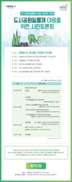 서울시와 녹색서울시민위원회 공동주최, 2020 도시공원일몰 대응 시민협의체 주관으로 진행하는 이번 토론회는 오는 19일 오후 3시, 서울시청 서소문청사 1동 13층 대회의실에서 개최된다.