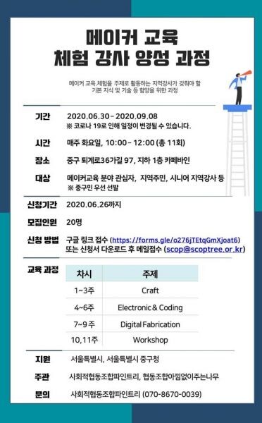 사회적협동조합 파인트리와 협동조합 아낌없이주는나무가 주관하며 참여자가 메이커교육의 체험강사 또는 보조강사가 돼 각자의 콘텐츠를 구성하고 이를 활용해 관련 사업에 참여해 볼 수 있도록 하는 취지로 기획됐다.