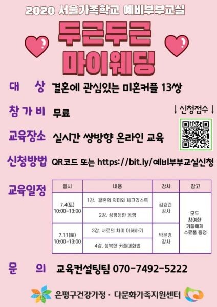 [무한뉴스] 은평구건강가정·다문화가족지원센터에서는 서울 가족학교 사업의 일환으로 결혼을 준비하는 예비부부 및 미혼커플을 대상으로 오는 7월 4일 7월 11일 10:00~오후 1시 양일간에 걸쳐 ‘두근두근 마이웨딩’을 온라인교육으로 진행한다.