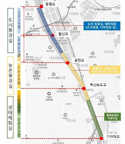 금천구가 한내천을 주민뿐만 아니라 관광객들이 즐겨 찾는 지역명소로 만들기 위해 둔치를 활용한 ‘테마풍경길’ 조성사업을 추진하고 있다.