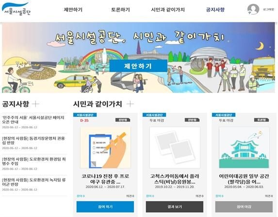 새롭게 공개된 서울시설공단의 웹페이지는 제안하기 토론하기 ‘시민과 같이가치’ 등 3개의 메뉴로 구성되어 있다.