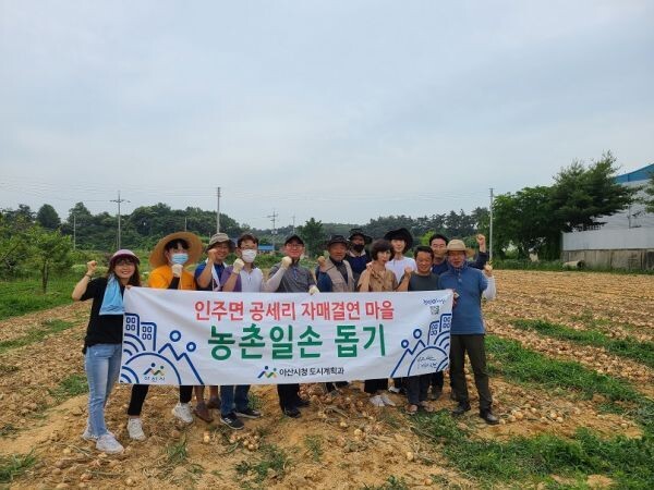 [무한뉴스]아산시 도시계획과는 지난 17일 코로나19로 인력난을 겪는 농가를 돕기 위해 1부서 1촌 자매결연 마을인 인주면 공세리 농가를 찾아 생산적 일손봉사에 참여했다.