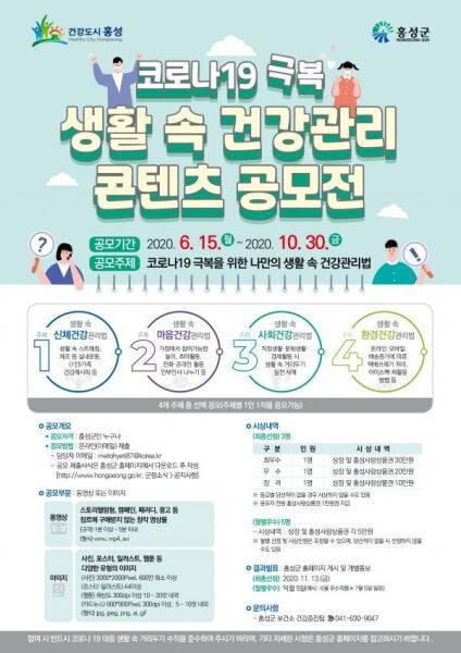 [무한뉴스] 홍성군 보건소는 지난 15일부터 오는 10월 30일까지 ‘코로나 19 극복 생활 속 건강관리 콘텐츠 공모전’ 을 실시한다고 밝혔다.