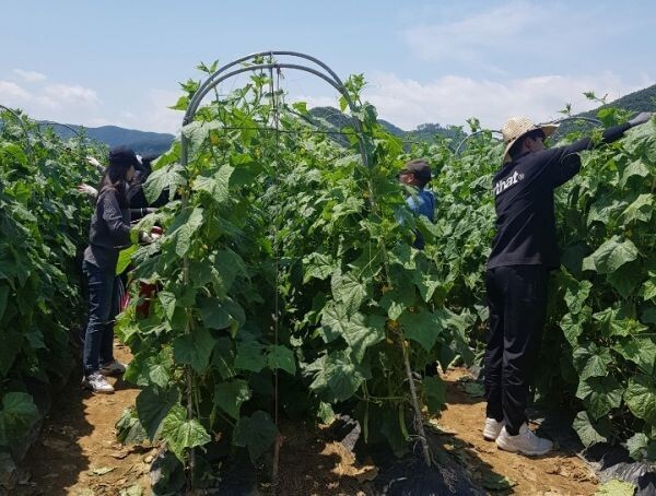 이들은 이날 무더운 날씨임에도 불구하고 농가주의 지도에 따라 오이 줄 매기와 수확 ·포장작업 등을 도우며 농가 시름을 덜어줬다.