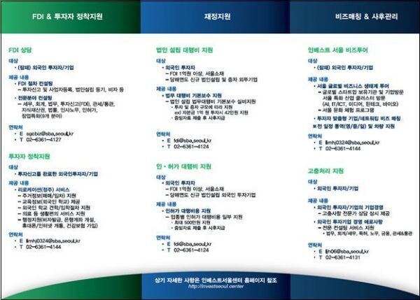 이외에도 해외 유수 산업 박람회 참가를 통한 잠재 외국투자가와의 비즈니스 미팅 등 인베스트서울센터에서 지원하는 다양한 프로그램에도 참여할 수 있다.