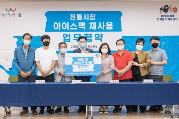 전국 최초로 아이스팩 재활용 수거 시스템을 구축한 강동구가 19일 구청 5층 대강당에서 전통시장상인회, 환경오너시민모임과 ‘전통시장 아이스팩 재사용 업무협약’을 맺었다.