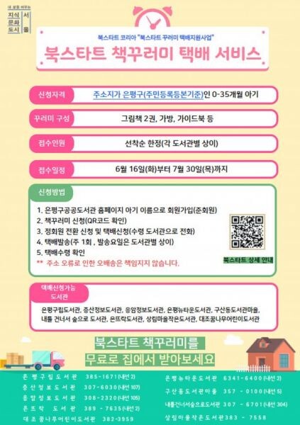 [무한뉴스] 은평구 공공·작은도서관은 북스타트 코리아 ‘북스타트 꾸러미 택배지원시범사업’의 일환으로 진행되는 북스타트 책꾸러미 택배 서비스를 6월 16일부터 7월 30일까지 실시한다고 밝혔다.