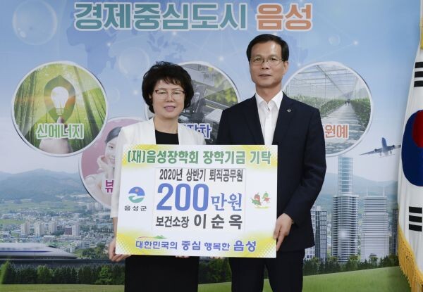 [무한뉴스] 이순옥 음성군 보건소장이 명예퇴임을 앞두고 지난 22일 음성장학회에 장학금 200만원을 기탁했다.