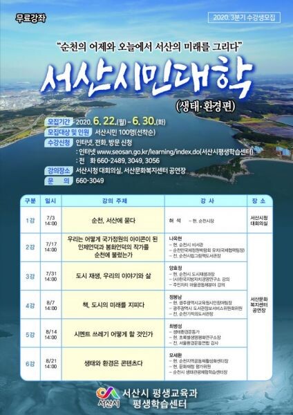 시 관계자는“서산시민대학 특별강좌는 ‘순천의 어제와 오늘에서 서산의 미래를 그리다’라는 주제로 진행되는 강좌인 만큼 우리 시와 닮은꼴인 순천시의 사례를 바탕으로 서산의 미래를 어떻게 그려야 할 것인가에 대해 고민해 보는 기회가 될 것으로 기대된다”고 말했다.