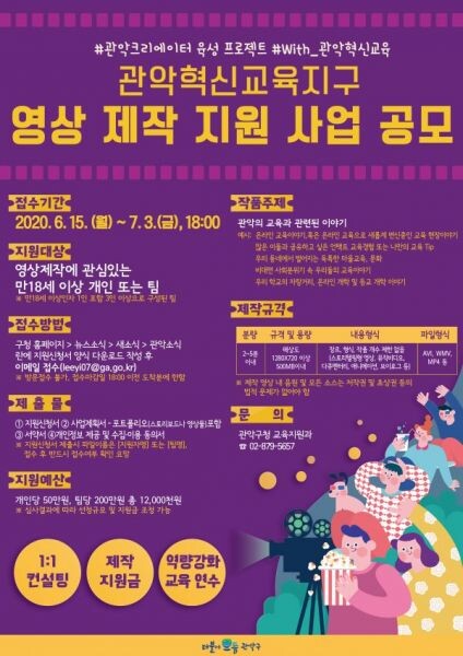 [무한뉴스] 관악구가 오는 7월 3일까지 ‘2020년 관악혁신교육지구 영상 제작 지원 사업 공모’를 시행한다.