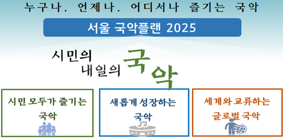 ‘서울국악플랜 2025’는 그동안 확충된 국악시설과 자원을 결집하고 연결해 국악로를 세계적 국악 관광명소로 만들기 위한 장기종합 발전계획이라고 전했다.